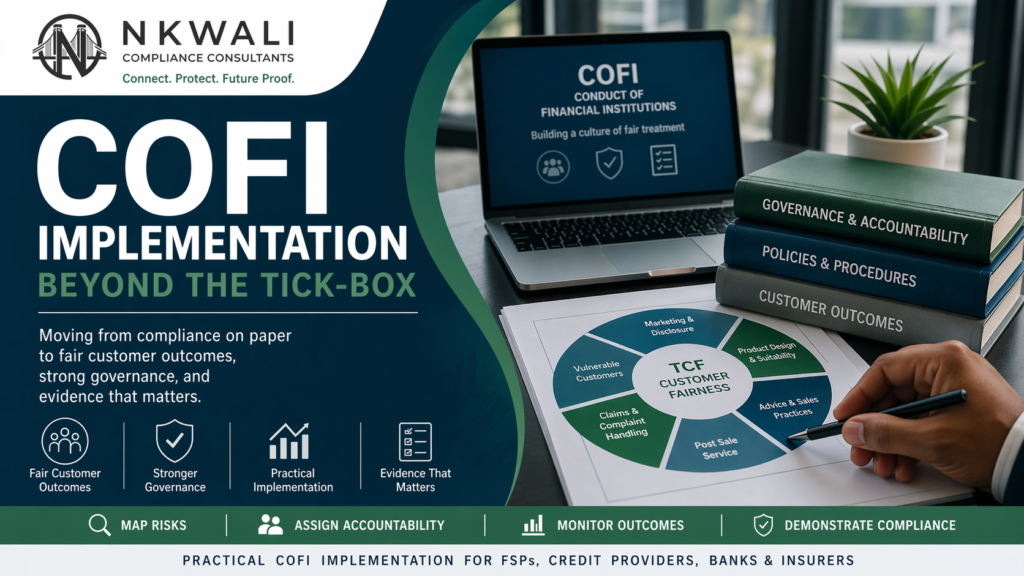 Nkwali Compliance Consultants is an FSCA-registered compliance practice specialising in COFI readiness and implementation for FSPs, credit providers, banks, and insurers. More specifically, we focus on implementation in practice — converting conduct requirements into controlled processes, outcome-based monitoring, management evidence, and customer-focused governance.